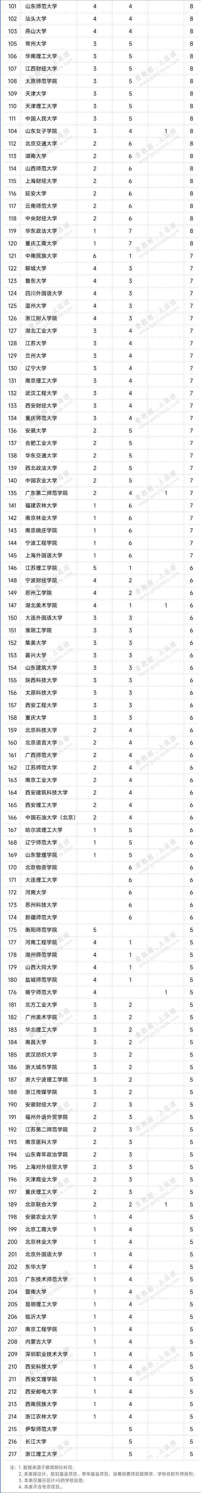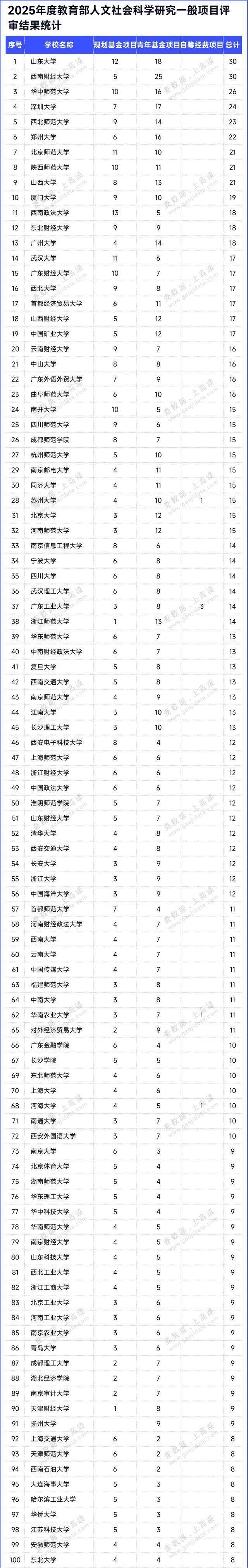 在规划基金、青年基金、自筹经费项目,西部和边疆地区项目,新疆项目,西藏项目4类项目评审公示结果中,山东大学、西南财经大学共30项,入选项目数并列第一;其次是华中师范大学入选26项,入选项目数量进入前三。