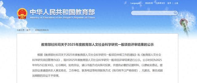 9月25日,教育部社科司公示了2025年度教育部人文社会科学研究一般项目评审结果。